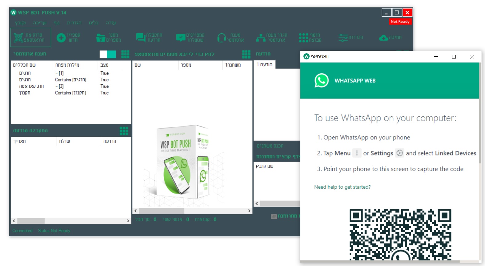 התוכנה חוקית. עם זאת חשוב לציין כי תנאי השירות של וואטסאפ לא מאפשרים עבודה עם אוטומציות שליחה ע"מ להימנע מספאם למשתמשי האפליקציה. לשימוש אפקטיבי וללא חסימות של וואטסאפ יש לעבוד עם התוכנה בהתאם להדרכה שתקבלו מאיתנו.